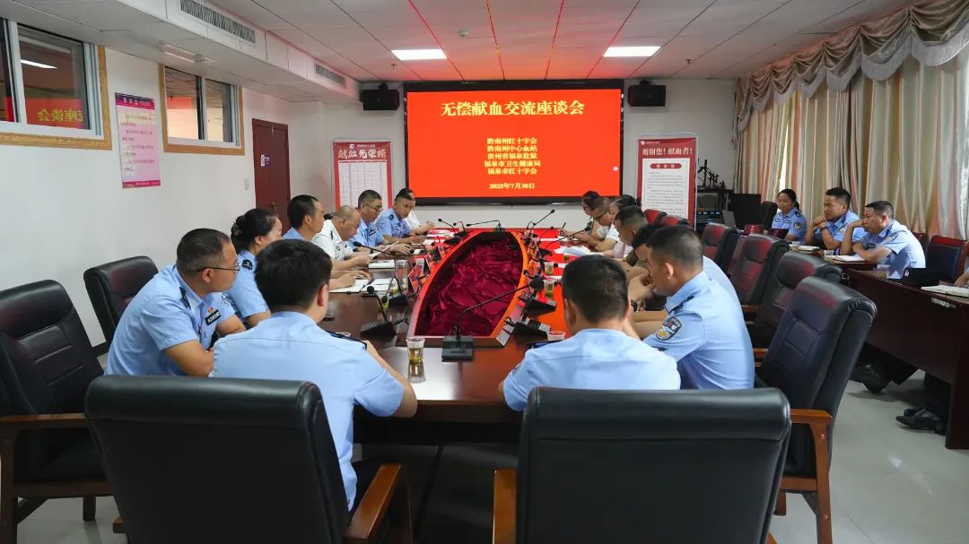 近日,黔南州红十字会常务副会长罗晓霞带领黔南州中心血站、福泉市卫生健康局、福泉市红十字会相关工作人员一行5人到贵州省福泉监狱,向监狱积极投身公益事业、无偿献血1000毫升以上的民警颁发感谢状,并开展座谈交流。监狱党委副书记、政委鲍晓飞,党委委员、政治处主任陈腾飞及部分献血民警代表参加座谈交流。